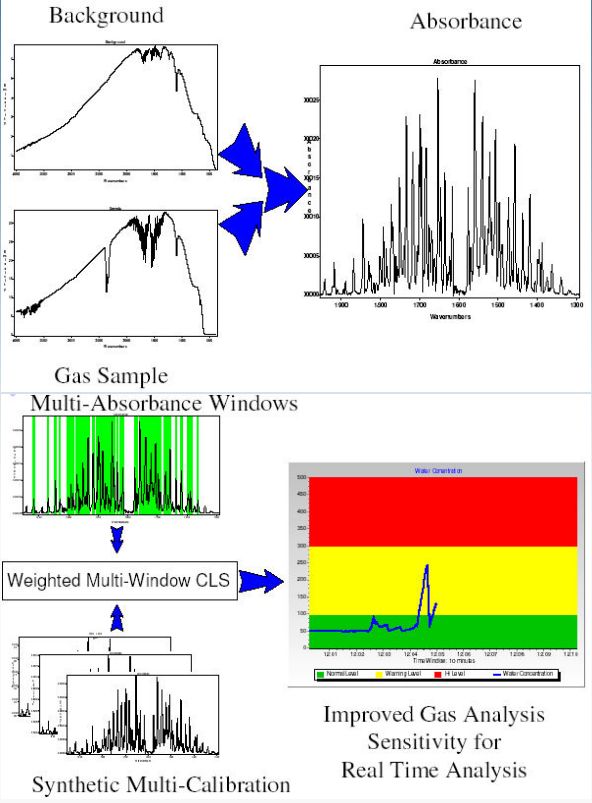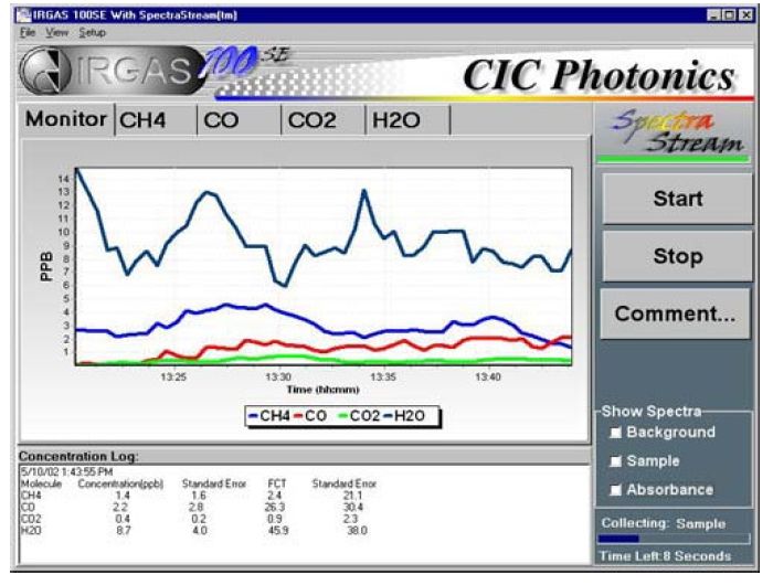 One of the more interesting aspects of SPGAS is the use of automated mirrors that can be installed in CICP’s gas cells. With automated mirrors, SPGAS software can run the SpectraStream Module (U.S. Patent # 6,748,334) to rapidly collect background spectra and sample spectra one after the other. This allows the SPGAS software to update the background spectra to compensate for small changes in the background levels of such constituents as CO2 and moisture. This provides a more accurate baseline subtraction routine which results in more accurate spectral modeling and more accurate results. The other advantage of running SpectraStream is the ability to identify even small changes in the sample spectra over the background spectra and report these changes to the operator.