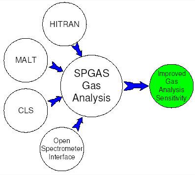 SPGAS does more than run ABB Bomem spectrometers. As seen in the Figure below, properly configured, the SPGAS software package can automatically run external hardware in support of the FTIR spectrometer. This allows SPGAS to collect temperature and pressure data and modify the calibration information to compensate for small changes in the gas cell temperature or pressure. SPGAS can also control valves and external events and track which gas stream is being sampled at any point in time.