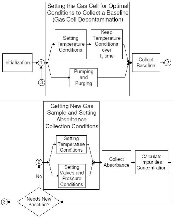 A further advantage of automated mirrors is the ability to collect background spectra without having to clear the gas cell. This allows the gas cell to remain in operation continuously without having to be purged in order to collect an in-cell background spectra. This reduces the complexity of the system by eliminating the purge gas and the valves required to control the purge gas. It also allows the IRGAS system to operate in a remote location and in a completely automated manner without user intervention.