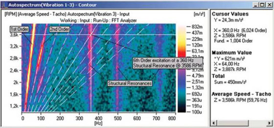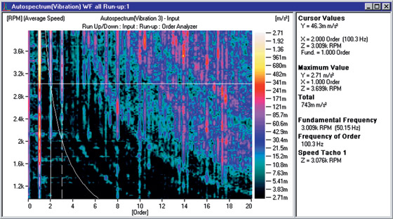 Displaying these stored FFT spectra allows the identification and extraction of orders and/or frequency bands (structural resonances). The amplitude and/or phase of the various orders as a function of RPM are obtained by cutting and extracting oblique slices from contour plots showing frequency spectra versus RPM.