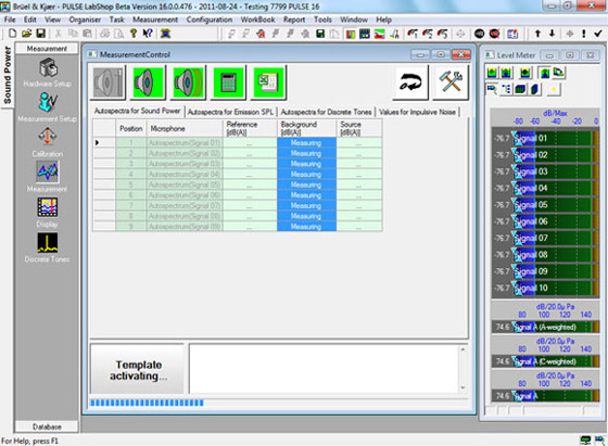 Additional microphones and additional localised microphones can to be added to the setup. Different stages of the measurement can be accessed to optimise the process and to avoid unnecessary time-consuming repetitions (for example, background noise measurements). An interactive setup table guides the user through the measurement setup (e.g. see Fig. 1). Measurement setup, calibration values and background noise measurements can be stored in PULSE projects for future use.