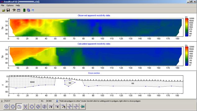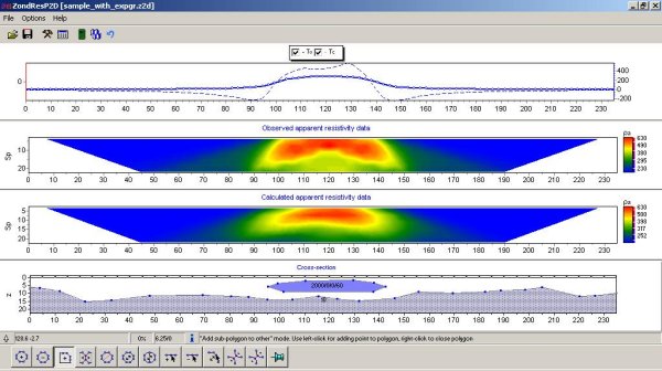 ZondRes2Dp is designed for 2D Resistivity and IP data interpretation in land and borehole version. The tasks of the program are similar to the ZondRes2D, but this program uses polygonal variant for describing geolectric medium. This approach gives some advantages for data inversion above some sort of a section. Using this approach, 2D section of any geoelectrical body is described with closed polygon.