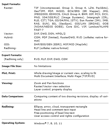 Many supported file formats, like almost any raster files (b/w, gray scale, color), vector (DWG, DXF, DGN), GIS (ESRI/MapInfo), hybrid files like RasterDWG, RVD or others can be previewed and loaded in a blink. Comfortable and fast zoom and pan functions allow for detailed inspection. If redlining is activated, all accessible redlining information will be displayed.