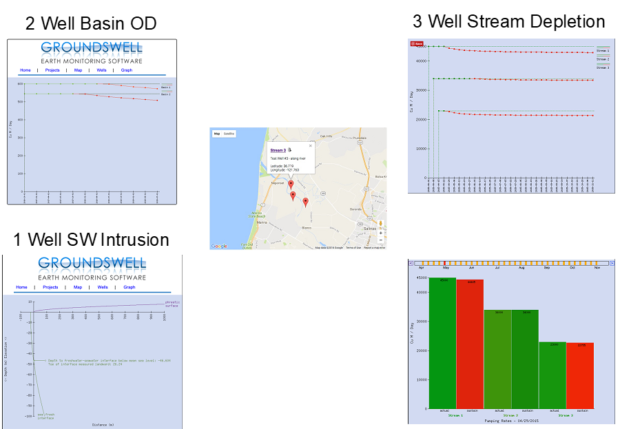 WSP Output Images. Various output options for rapidly determining maximum sustainable groundwater extraction rates and predicted date of unsustainability are displayed above. These types of analyses have the potential to dramatically change how groundwater is managed, and to save regions and nations from economic and environmental disaster.