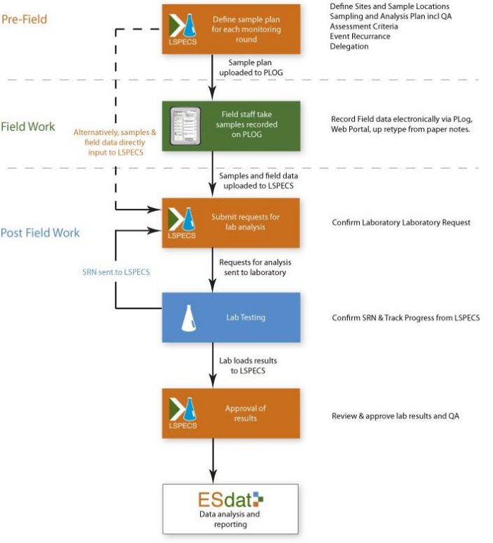 - For managers of assets (or associated consultants) with requirements for Monitoring Programs and/or field sampling events, LSPECS centralises control, reduces administration and management time (and therefore cost) and helps minimise risk of error.