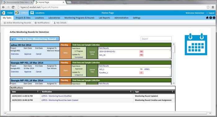 LSPECS (Laboratory Sample Planning Electronic COC and Signoff) is web-based, robust, updatable software that allows program managers to design, delegate and manage field programs from a single interface, thereby increasing efficiency, and reducing management/administration time (and therefore reducing cost). LSPECS has been developed as an extension of ESdat and integrates seamlessly with ESdat, providing complete control of field program planning, implementation review and analysis of results. It can be hosted internally by users, or a Software as Service version is also pending.