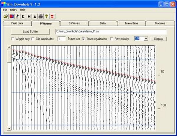 Grid with trace information and original SU file display. Import SEG2, SEG-Y,BISON, PASI, OYO, ABEM data files. Filtering and gain field records. Use 3 component geophones. Interactive P-waves and S-Waves first break picking. Invert and stack horizontal traces to enhance S-Waves. Produce travel time graph. Produce interval velocity graph. Compute Poisson ratio, Shear modulus. Graphs are ready to paste into your application (WMF) or to print. Provided with USB key to be used on the field on your laptop.