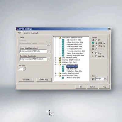 The WPCS (Wire Processing Communication Standard) is a flexible interface that enables the simple networking of fully automatic wire processing machines. WPCS is used to send production orders, article and material specifications to crimping machines. Orders are often managed together with material specifications by an ERP (Enterprise Resource Planning) system or MES (Manufacturing Execution System). They are sent to the desired wire processing machine via a network in the standardized WPCS format. Sources of error are reduced, product quality is ensured, and valuable time is saved as there is no need for manual data entry at the machine. Material consumption, quality and statistics data, machine errors, order and production status are also reported back via the WPCS interface for evaluation.