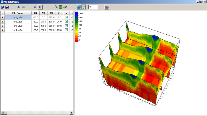 Z3DModelView software is designed for three-dimensional visualization of of one- or two-dimensional interpretation results from Zond software packet. In geophysical surveys, measurements usually got by a system of parallel lines. To better understand the structure of the site works such data useful to display in three dimensions. This allows us to effectively correlate structures for parallel lines, compare perpendicular lines at the intersection, to display the horizontal sections for a given depth.