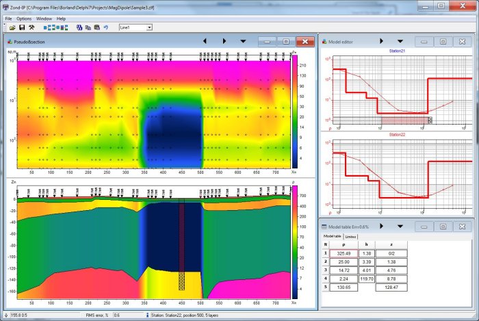 Depending on the interpreter’s choice, software gives different variants of data interpretation algorithms. Comfortable control system allows to choose from the great number of equivalents results that will appear to be the best in geophysical and geological point of view. Conception of multi-station interpretation is basis of the ZondIP1D software. Consequently, profile line data is considered as a reflection of geological section. It’s mean that multi-station data of profile line is whole, and not set of separated curves. Special windowed algorithms developed for interpretation of profile line data are provided in the software with every curve segment P-effect’s reduction. But most software features can be used also during work with the separated points of VES.