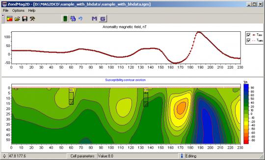 While program was designed special consideration given to a priori data accounting. Because of equivalence of inverse geophysical problems, quality of the obtained results strongly depends on the amount of a priori data used. In ZondMAG2d there is possibility of weights setting for measurements, fixing and limits making of changing features of different cells, using of a priori model as reference in inversion. There is also possibility to import and display results of measurements by other methods and cross-boreholes data that improved quality of results.