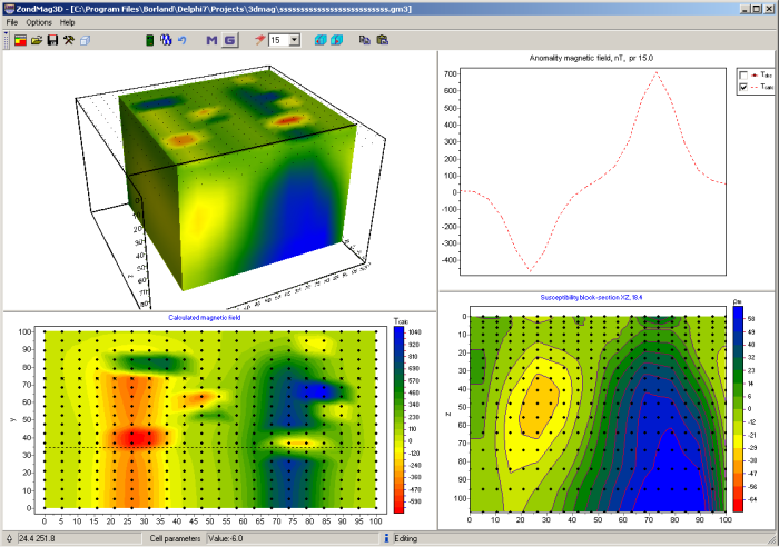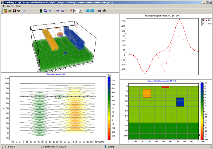 While program was designed special consideration given to a priori data accounting. Because of equivalence of inverse geophysical problems, quality of the obtained results strongly depends on the amount of a priori data used. In ZondMAG3d there is possibility of weights setting for measurements, fixing and limits making of changing features of different cells, using of a priori model as reference in inversion. There is also possibility to import and display results of measurements by other methods and cross-boreholes data that improved quality of results.