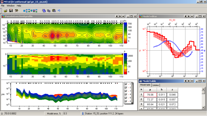 As the basic task of the program is inversion of geoelectric section parameters – few variants of inverse problem are realized in ZondMT1D, basic of them are: smoothed inversion – to get smooth, and focusing – to get the piece-smooth distributing of geoelectric parameters vs depth. Because of equivalence of inverse geophysical problems, quality of the obtained results strongly depends on the amount of used a priori data. In ZondMT1d there is possibility of weight setting (Error gates) for measurements, fixing and limiting of different layers parameters, using of a priori model as reference in inversion. If the values of some section parameters are known exactly (a priori or on interpretation results), their fixing is possible before the beginning of automatic interpretation. The fixed parameters do not change during the process of inversion. Fixing of parameters is the method for hard regularization of inversion process. The robust schemas of noise estimation are realized in the program. There is also possibility to import and display results of measurements by other methods and borehole data that can improve results.