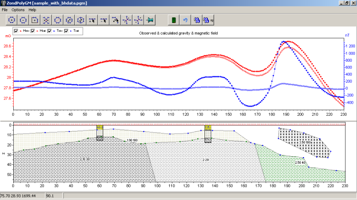 ZondPGM has wide set of tools for mathematical modeling of gravity and magnetic fields. In the software also there is a possibility to import and display results of measurements by other methods and cross-borehole data that improve interpretation results. Besides this, algorithms of polygon parameters and geometry inversion are included. They allow correct automatically parameters of objects.