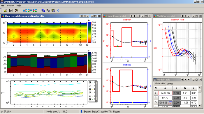 Conception of multi-station interpretation is basis of the ZondVMD1D software. Consequently, profile line data is considered as a reflection of geological section. It’s mean that multi-station data of profile line is whole, and not set of separated curves. Special windowed algorithms developed for interpretation of profile line data are provided in the software. But most software features can be used also during work with the separated points of EMS. You can use areal XY survey with arbitrary lines orientation in multi-line mode.