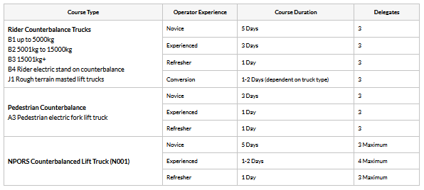 We offer training on all sizes and capacities of counterbalance trucks from smaller maneuverable electric 3 wheelers through to more powerful 50,000kg capacity diesel machines for heavy duty loads.
