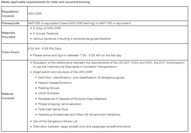 This course reviews the basic skills needed to prepare, offer and accept shipments of dangerous goods for transportation by aircraft and related motor vehicle transportation. This course is endorsed by IATA. Participants successfully completing this course will be registered with the IATA training registry.