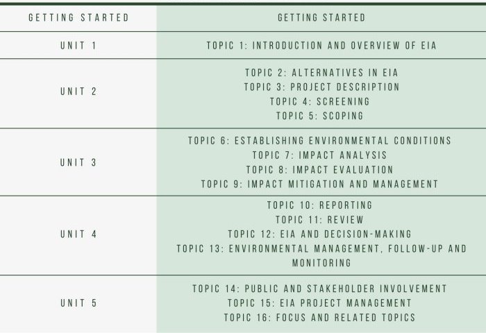 The Foundations of Impact Assessment course provides individuals involved in environmental impact assessment (EIA) with knowledge of the basic tools needed to carry out EIA responsibilities. This training aligns with the knowledge expected of an IA Practitioner or IA Administrator per IAIA`s Guideline Standards for IA Professionals. While the course doesn`t make you an EIA expert, it empowers you to participate effectively in the multi-disciplinary aspects of EIA studies and learn and grow into an EIA leadership role. Divided into five units, each addressing several unique topics, the course employs a metaphorical "toolbox" framework. As you progress, recognize that each EIA situation is unique, requiring you to utilize specific "tools" at any point. The course guides you in understanding the tools in your EIA toolbox, their purpose, and when to deploy them.
