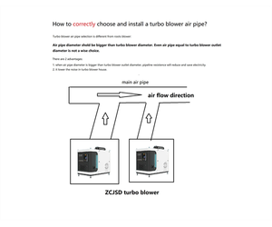 Air pipe diameter shold be bigger than turbo blower diameter. Even air pipe equal to turbo blower outlet diameter is not a wise choice.